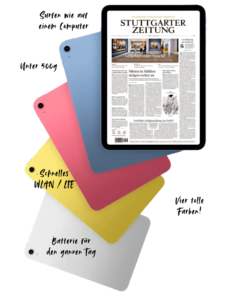 Mit dem Digital-Bundle der Stuttgarter Zeitung erhalten Sie nicht nur Zugang zur täglichen digitalen Ausgabe als E-Paper, sondern auch das iPad der neuesten Generation besonders günstig dazu. Sie können außerdem das gesamte Online-Angebot der StZ nutzen, mit allen Artikeln auf der Webseite und in der StZ News-App inklusive StZ Plus-Artikel.